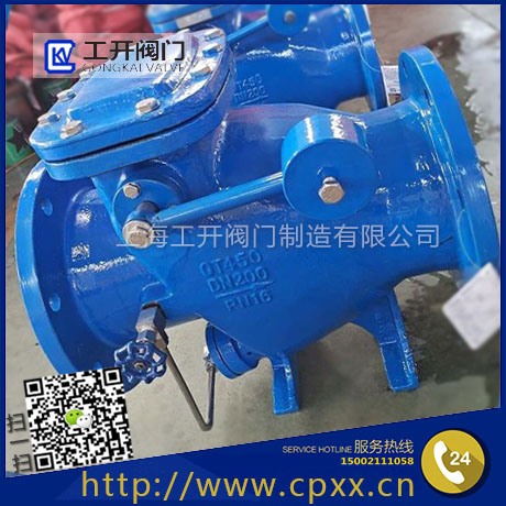 微阻缓闭式止回阀工作原理:靠进水口介质的流速水头作用,阀瓣自动开启使介质通过。阀体内的压力水通过微量阀流进活塞组件的后腔,将活塞从活塞腔内推出。当水流停止时(或水泵突然停止运行时),由于阀瓣的自重和水倒流的作用,使阀瓣自动关闭。但是由于活塞处于推出位置,顶住阀瓣,使阀瓣不能将阀口全部关闭还剩余20%的开度使水流通过,这时就减弱了水锤压力。当阀瓣压在活塞的端部时,由于反作用力的产生,使活塞后腔的水阻止活塞退出,亦阻止阀瓣的关闭,这时只能通过微量调节阀缓缓流回隔离装置,使阀瓣徐徐关闭。阀瓣分成快速和缓慢两步关闭达到了既防逆又减弱水锤的作用。活塞伸出长短决定了阀瓣缓闭的开度。缓闭开度大,水锤小,延长关闭时间;反之,开度小,会产生破坏性水锤。