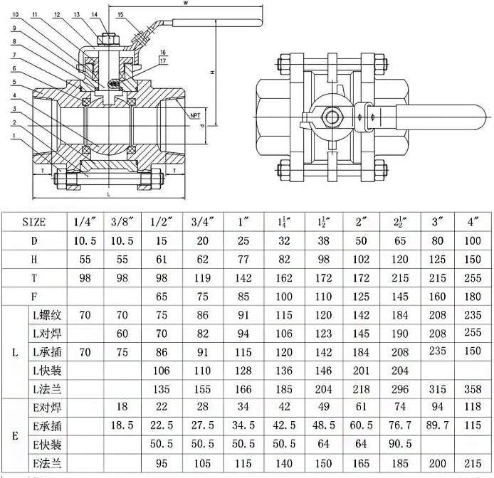 Q11F三片式丝口内螺纹球阀产品外形结构及主要连接尺寸