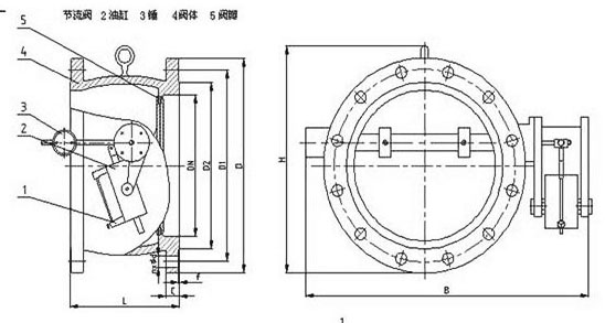 HH47X缓冲蝶式止回阀是由阀体、阀瓣、缓冲装置和微量调节阀组成。