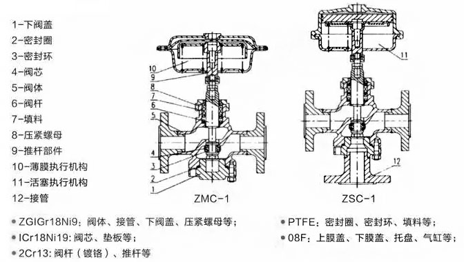 ZMC或ZSC型气动二位切断阀,由气动薄膜(活塞)执行机构和切断阀两部分组成,当无信号输入时,执行机构由于弹簧预紧力,使阀芯关闭阀座,当输入350KPa空气信号压力时,由活塞所产生的推力作用于托盘推动阀杆向下动作,使阀芯关闭下阀座,以实现管道内流动介质的切换或切断。