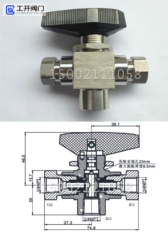 不锈钢高压三通球阀,加气枪阀耐压6000PSI ,耐温-40 + 160 ,不锈钢材质.结构尺寸如下: