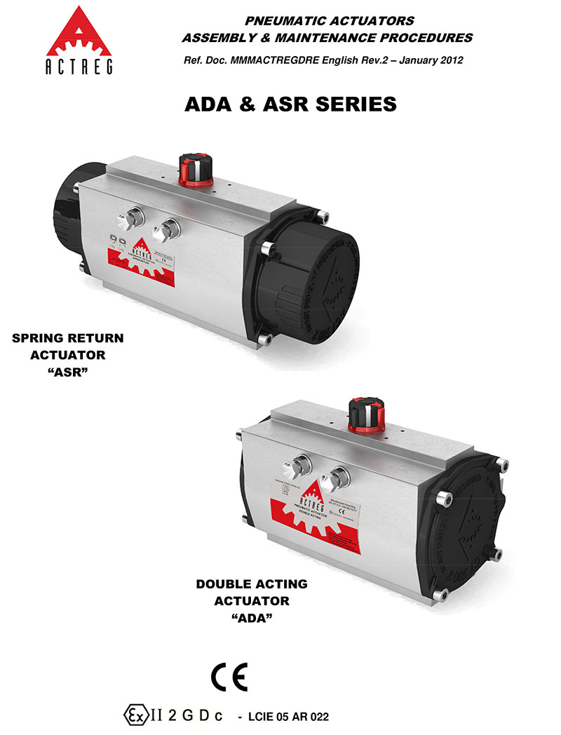 西班牙ACTREG艾川格气缸-ASR单作用执行器配有双向齿轮轴行程限位装置。位于壳体侧面的行程限位装置允许气动执行机构行程在85°和95°之间作±5°的调整。设计这2个行程限位装置同时是为了抵抗气动执行机构的最大额定扭矩和吸收由推荐行程速度所带来的最大冲击载荷松开锁定螺母,可进行逆时针和顺时针的限位螺钉旋转,分别转动左边的限位螺钉和右边的限位螺钉可减小或增加行程角度,最后旋紧锁定螺母。