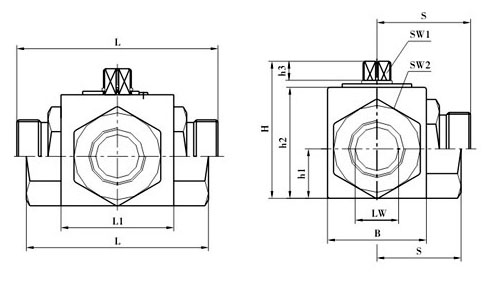KHB高压三通球阀有T型和L型。T型能使三条正交的管道相互联通和切断第三条通道,起分流、合流作用。L型只能连接相互正交的两条管道,不能同时保持第三条管道的相互连通,只起分配作用。