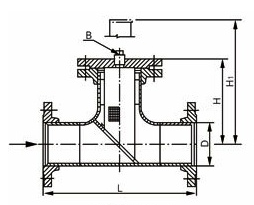 T型过滤器主要由壳体、滤芯、壳体法兰、壳体法兰盖及紧固件等组成。当流体通过进口进入壳体流经置有一定规格丝网的滤芯后,其固体杂质颗粒被阻挡在滤芯内,而洁净的流体通过滤芯,由过滤器出口流出。当需要清洗时,只需打开下端排污口排净流体,拆卸壳体法兰盖,拿出滤芯清洗后重新装入即可。