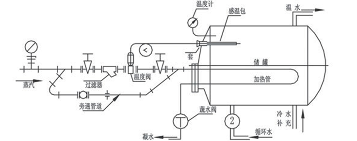 以蒸气或高温水为例进行说明,蒸汽或高温水在加热器将冷水加热到要求的温度,在温度阀前后装有截止阀用于检修或停止加热时,截断流过调节阀的蒸汽(或高温水)。旁路则在调节阀故障或检修时备用,正常运行时旁路关闭。感温包安装的热水的出口处。