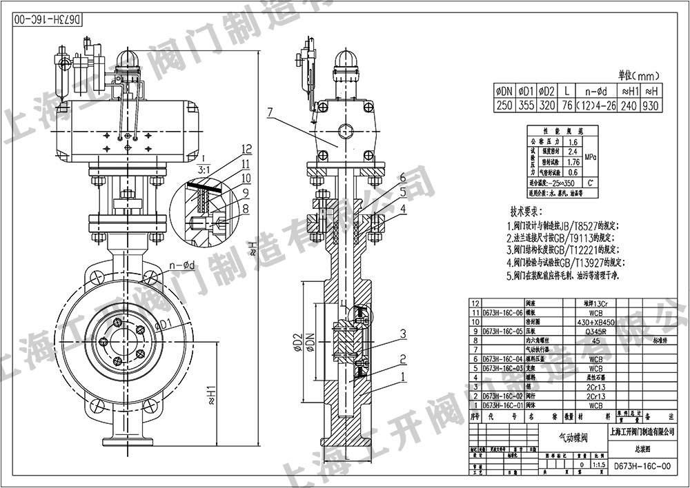 气动蝶阀D673H-16C-DN250蝶阀图纸尺寸