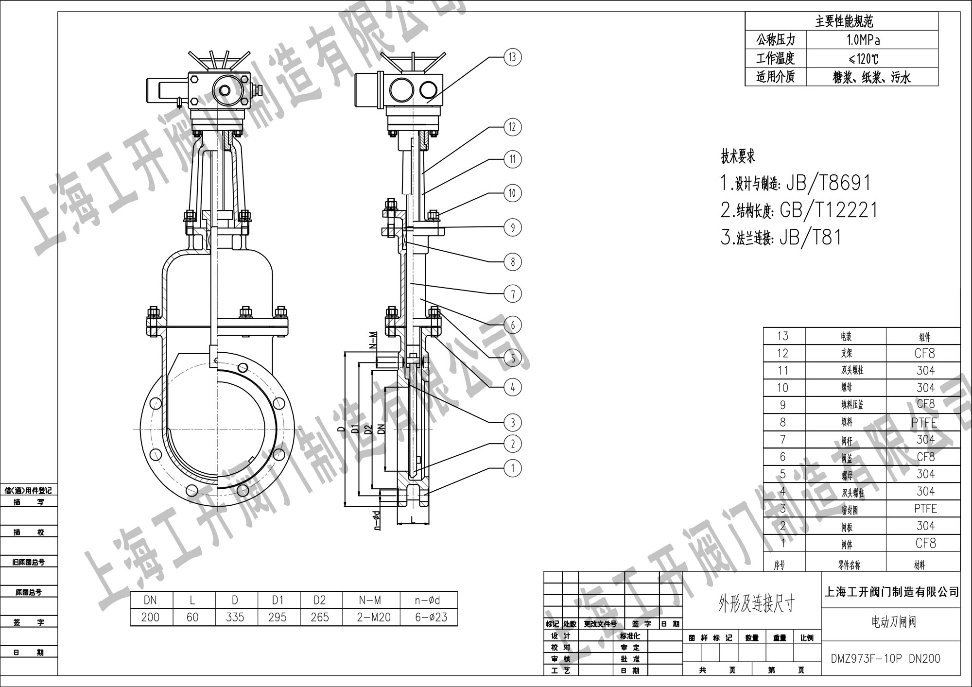 DMZ973F-10P-DN200电动刀闸阀带盖暗杆图纸