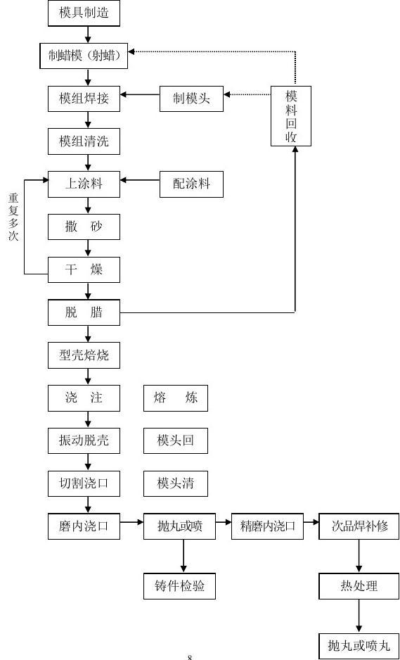 ① 铸型(使液态金属成为固态铸件的容器)准备,铸型按所用材料可分为砂型、金属型、陶瓷型、泥型、石墨型等,按使用次数可分为一次性型、半永久型和永久型,铸型准备的优劣是影响铸件质量的主要因素;