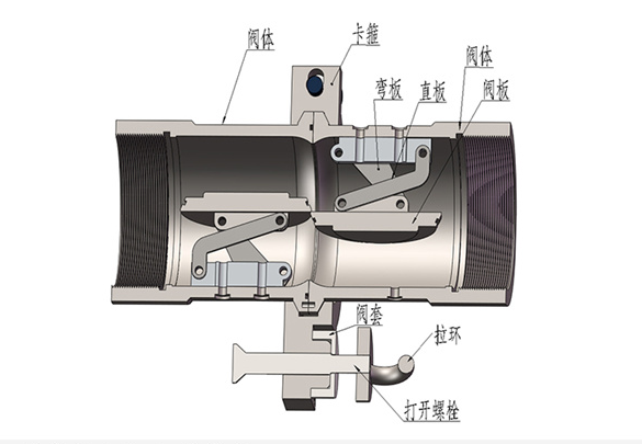 拉断阀由两个单向阀、夹紧机构、拉断机构三个部分组成。