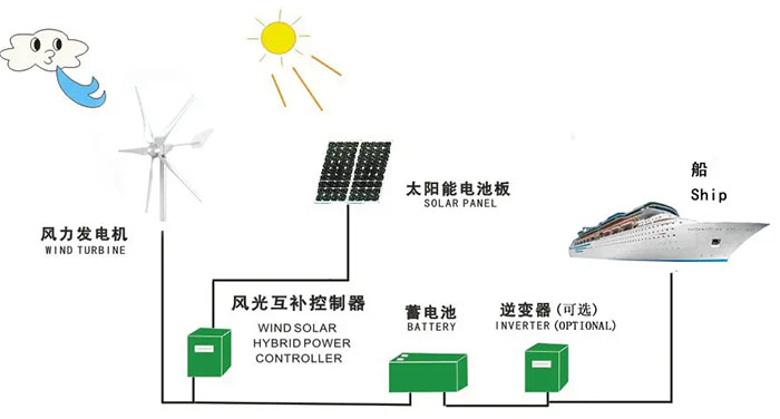 风光互补发电系统主要由风力发电机组、太阳能光伏电池组、控制器、蓄电池、逆变器、交流直流负载等部分组成。该系统是集风能、太阳能及蓄电池等多种能源发电技术及系统智能控制技术为一体的复合可再生能源发电系统。