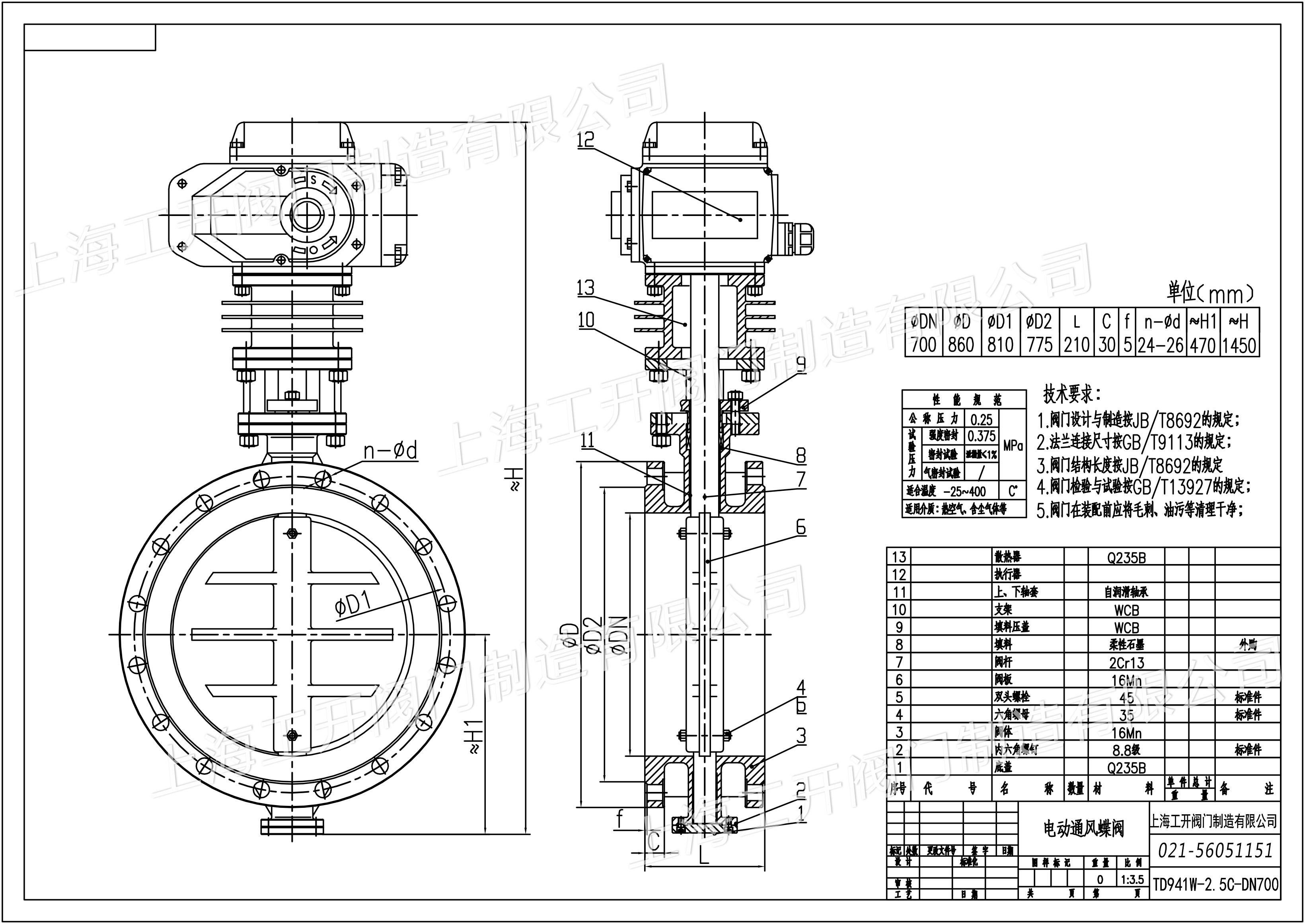 阀门图纸-电动蝶阀TD941W-2.5C-DN700结构尺寸图
